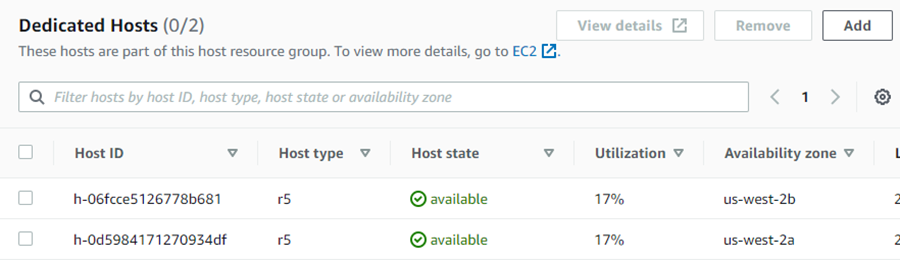 Figura 14: Lista de hosts dedicados asignados en la consola de EC2 que están administrando los grupos de recursos de host que creó anteriormente.