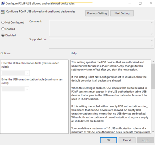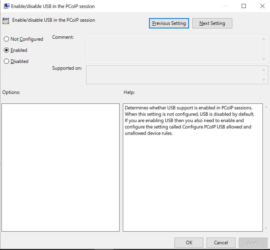 Para esta configuración, debemos crear una nueva política que habilita el USB para la sesión PCoIP (teniendo siempre en cuenta los periféricos compatibles: teclados y ratones USB/Bluetooth, auriculares de audio USB e impresoras USB).