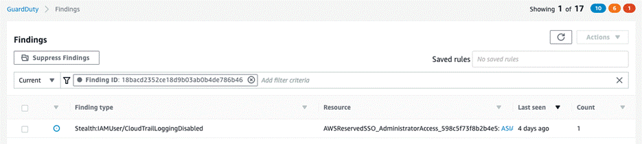 Echemos un vistazo a un resultado denominado CloudTrailLoggingDisabled en GuardDuty a medida que comenzamos a tratar de responder a estas preguntas. Cuando accede a la consola de GuardDuty, aparece una lista de sus hallazgos recientes. En la figura 1, se aplicó un filtro para mostrar la detección de CloudTrailLoggingDisabled.