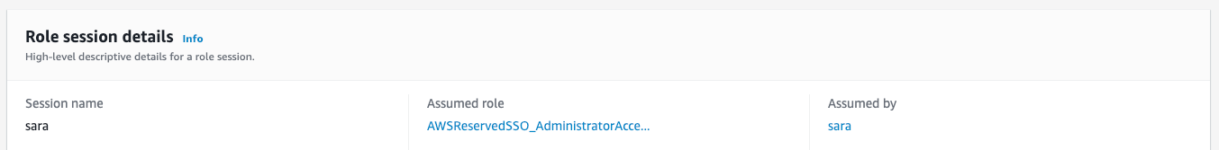 - Vuelve a la parte superior de la página de búsqueda de perfiles. En el panel Detalles de la sesión del rol (Role session details), elija AWSReservedSSO_AdministratorAccess_598c5f73f8b2b4e5.