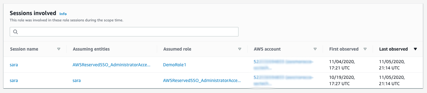 - En el panel Sesiones involucradas (Sessions involved), en la columna Nombre de la sesión (Session name), busque la fila en la que Demorole1 es el Rol asumido (Assumedrole). Elija el nombre de la sesión en esta fila, Sara, para ir a la página de perfil de la sesión de rol.