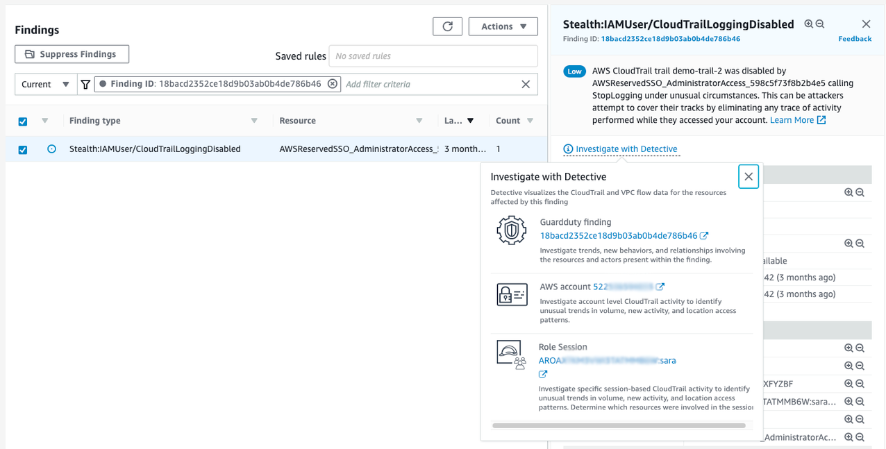 Ahora que hemos determinado que el patrón de acceso y las actividades de Sara son consistentes con su comportamiento anterior, usemos Detective para analizar más a fondo las actividades de Sara y determinar si inhabilitó accidentalmente el registro de CloudTrail o si hubo una posible intención maliciosa detrás de su acción.