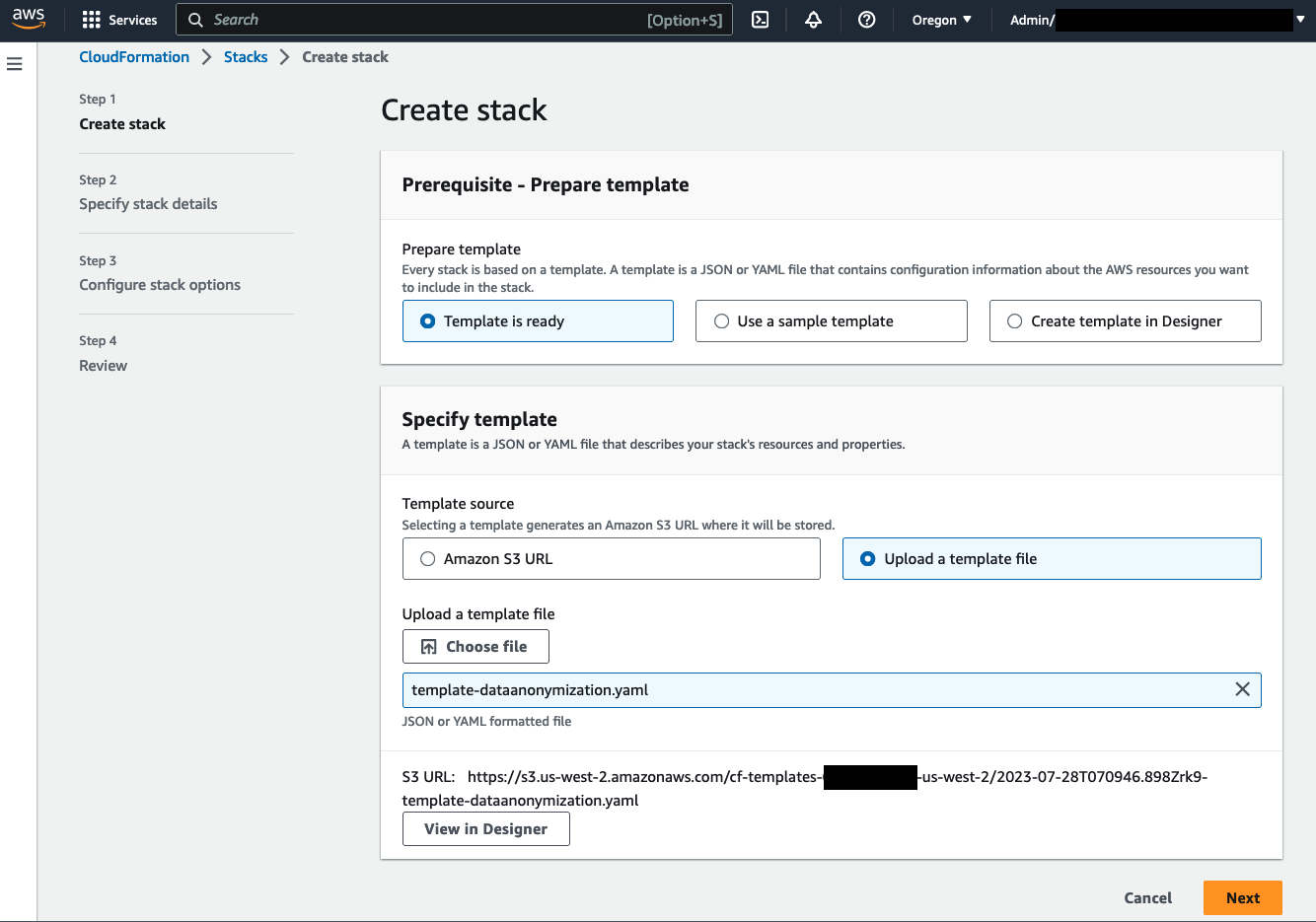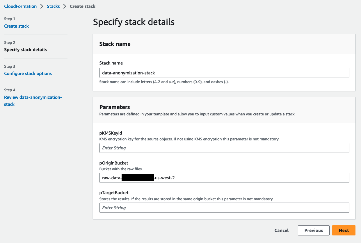 - Añada un nombre para la pila, como data-anonymization-stack, y adicione los otros campos con los valores necesarios; el nombre del bucket de S3 donde se encuentran sus archivos en crudo es mandatorio, y si estos archivos están encriptados con una llave KMS, también debe añadir el ID de la llave. El bucket de salida solo es necesario en caso de que quiera guardar los resultados en un bucket diferente, de lo contrario, no es mandatorio. Luego seleccione Siguiente dos veces dejando el resto de configuraciones com sus valores por defecto.