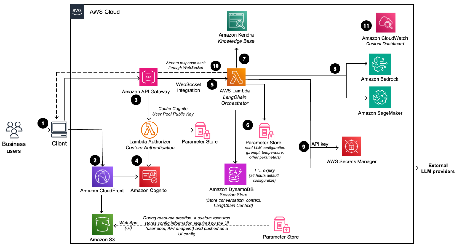 9- Si utiliza un LLM externo a AWS es necesario utilizar credenciales en forma de “API key“. Las keys se almacenan en AWS Secrets Manager.