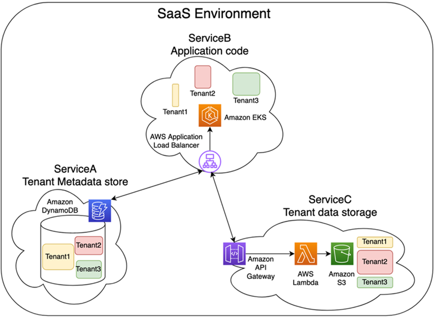 Un ejemplo típico en un entorno de Amazon Web Services (AWS) es una solución SaaS que almacena datos de tenants en Amazon Simple Storage Service (Amazon S3) y utiliza Amazon DynamoDB para administrar el perfil de usuario junto con un clúster de contenedores como la solución de cómputo que genera informes para los usuarios.