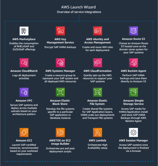 Durante este tiempo, también hemos proporcionado actualizaciones para admitir un número cada vez mayor de integraciones de servicios de AWS. En la actualidad, AWS Launch Wizard está integrado con más de 15 servicios, lo que le permite iniciarlos o utilizarlos en orquestaciones durante implementaciones de SAP.