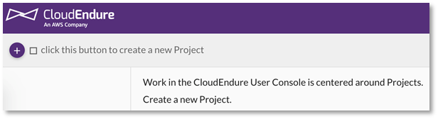 La experiencia de CloudEndure se basa en Proyectos, que son las unidades organizativas básicas para sus migraciones o entornos de recuperación ante desastres. Después del proceso de inicio de sesión, haga clic en el icono en la esquina superior izquierda para crear un nuevo proyecto: