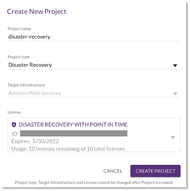 Rellene los cuadros con el nombre del proyecto, el tipo de proyecto y elija la licencia correspondiente. Para el tipo de proyecto, elija «Disaster Recovery». Después de completar la información, haga clic en «CREATE PROJECT»: