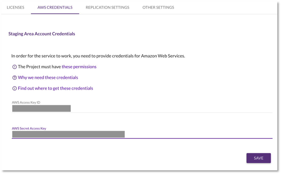 En «AWS CREDENTIALS», especifique el ID de clave de acceso de AWS y la clave de acceso secreto de AWS. CloudEndure llama a las API apropiadas para replicaciones a través de esta clave de acceso. Si no tiene un usuario de IAM con los permisos necesarios para que CloudEndure funcione, consulte esta documentación.