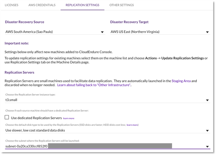 En «REPLICATION SETTINGS», seleccione la región de origen, la región de destino, el tipo de instancia del servidor de replicación, el tipo de disco predeterminado y la subred donde se iniciarán los servidores de replicación. En el siguiente ejemplo, estamos definiendo un entorno primario en América del Sur (sa-east-1) con el objetivo de Recuperación ante Desastres en Norte de Virginia (us-east-1):