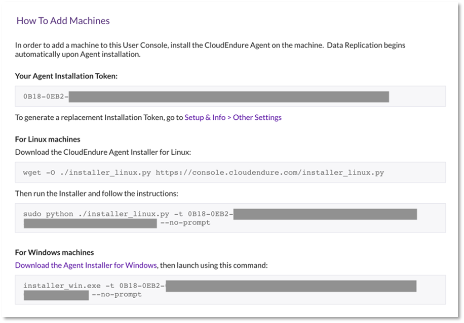 La siguiente ventana muestra instrucciones para agregar máquinas para la replicación, que incluyen el token de instalación del agente y los comandos adecuados para descargar y ejecutar el instalador de CloudEndure. Usaremos esta información para crear nuestro sencillo playbook Ansible: