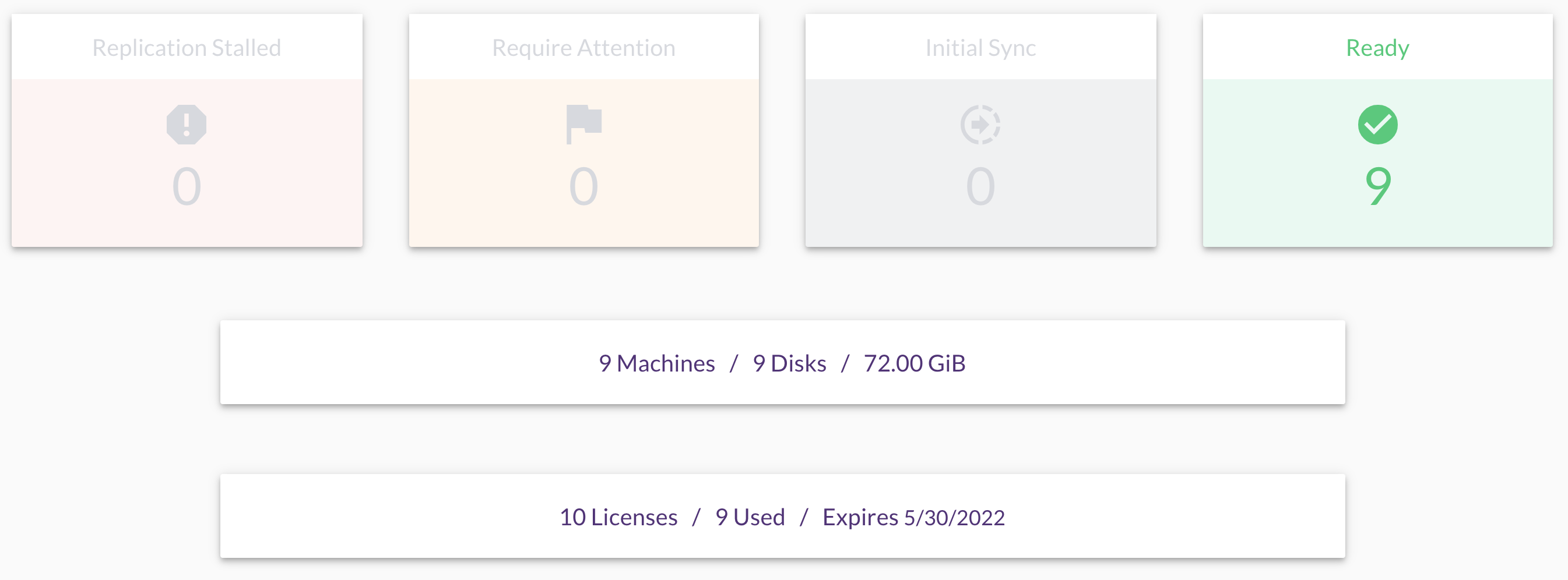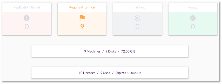 Una vez completada la replicación inicial, debería ver en el panel el cuadro «Require Attention» con el número de máquinas replicadas. Esto significa que las máquinas se están replicando, pero nunca se han probado:
