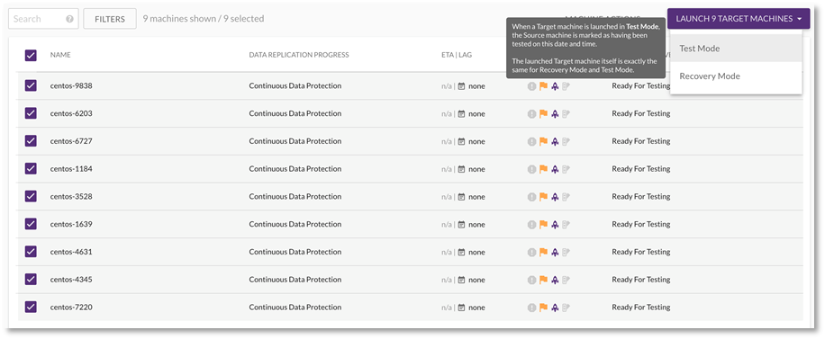 Como práctica recomendada, es importante probar la recuperación ante desastres y puede hacerlo iniciando las máquinas en la región de destino en «Test Mode». Seleccione las máquinas que desea probar y en la esquina superior derecha, haga clic en «Test Mode»:
