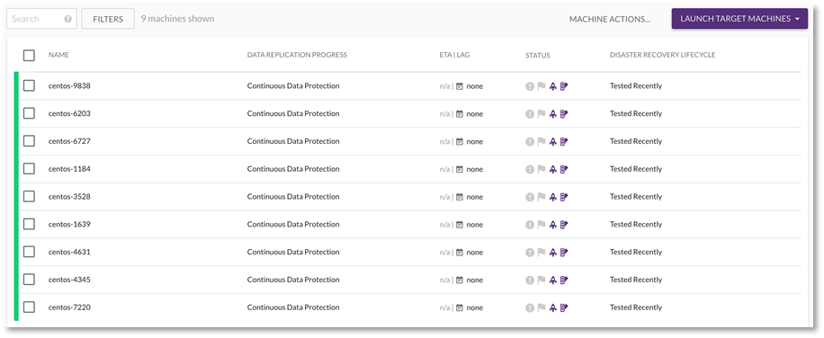 En la consola de CloudEndure, el estado de «DESASTRY RECOVERY LIFECYCLE» se cambiará a «Tested Recently» para cada equipo probado durante este proceso. Para «DATA REPLICATION PROGRESS», el estado será «Continuous Data Protection».