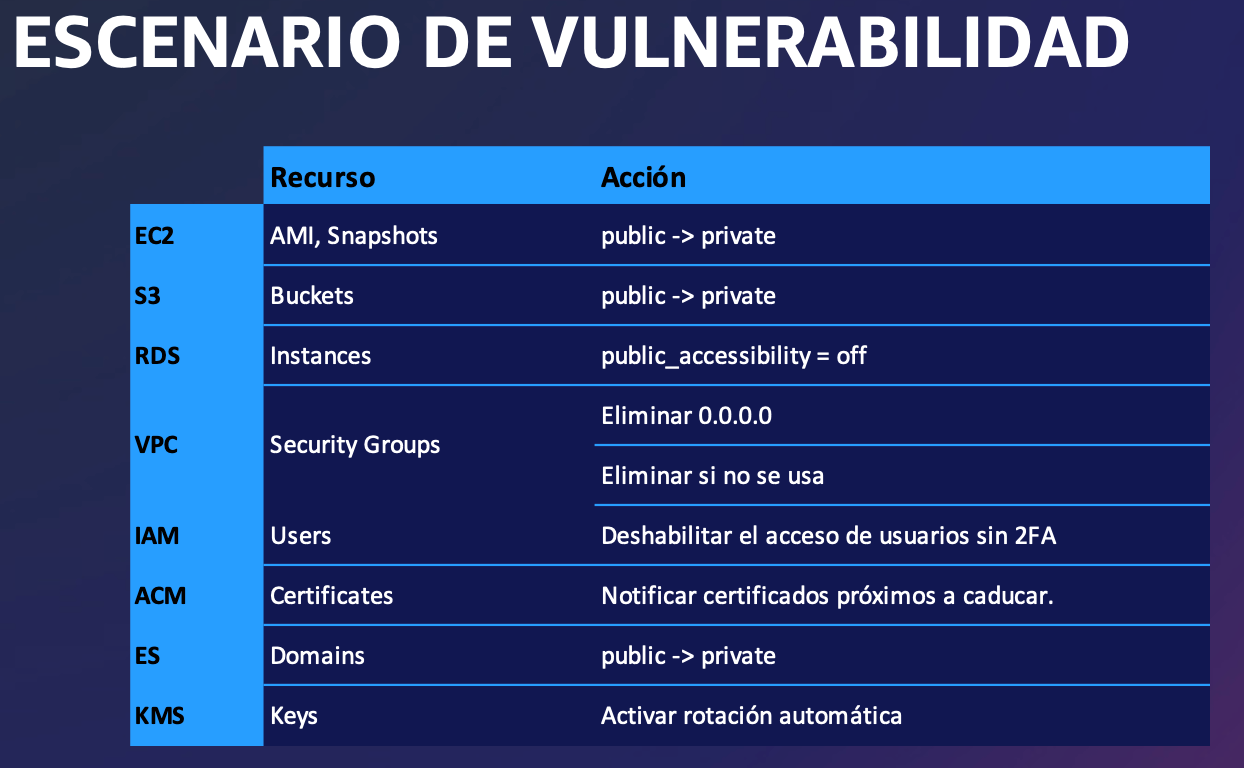 - Busca y crea los escenarios de vulnerabilidad (basándose en las conclusiones de AWS Security Hub, Prowler y las buenas prácticas en la nube (basadas principalmente en las mejores prácticas de seguridad fundamentales de AWS y en el análisis de referencia de CIS de AWS Foundations);
