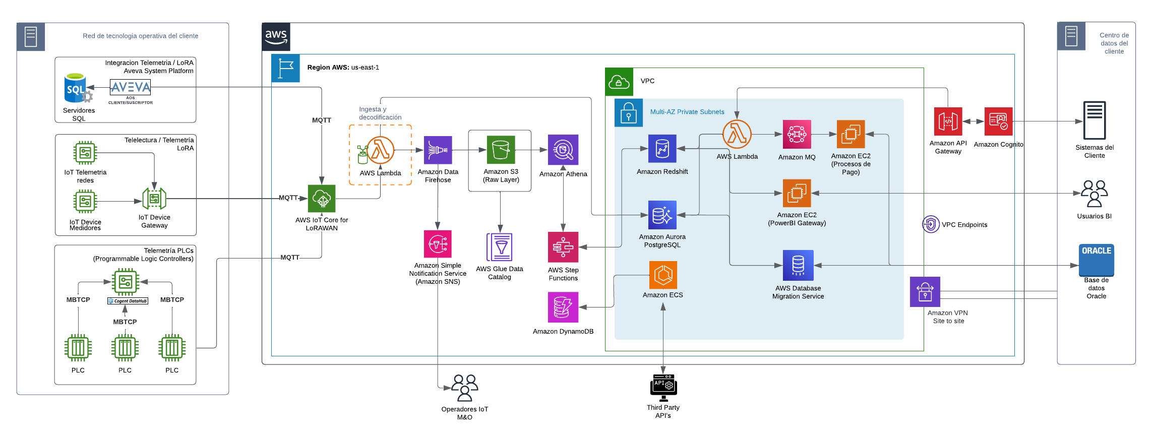 La compañía implementó una solución avanzada utilizando AWS Lambda y Amazon ECS (Elastic Container Service) para desplegar microservicios capaces de escalar automáticamente según la demanda. Gracias a Amazon API Gateway, lograron exponer sus servicios SOAP como APIs REST, lo que facilitó la integración con otros sistemas. Utilizaron AWS DMS (Database Migration Service) para integrar datos provenientes de diversas fuentes (como bases de datos Oracle y SQL Server) hacia Amazon Redshift, optimizando el manejo de la información. Además, implementó Amazon CloudWatch para monitorear y obtener visibilidad completa sobre el rendimiento de la infraestructura. A través de AWS IoT Core for LoRaWAN, centralizaron los datos de consumo de agua de todos sus clientes, mejorando la eficiencia en el monitoreo de los medidores y garantizando alta disponibilidad y baja latencia en sus servicios nativos de la nube. Además, se contemplaron políticas de acceso controlado, encriptación de datos en reposo mediante claves gestionadas y encriptación en tránsito con protocolos seguros. Esta arquitectura mejoró significativamente tanto el rendimiento como la integración de sistemas dentro de la compañía.