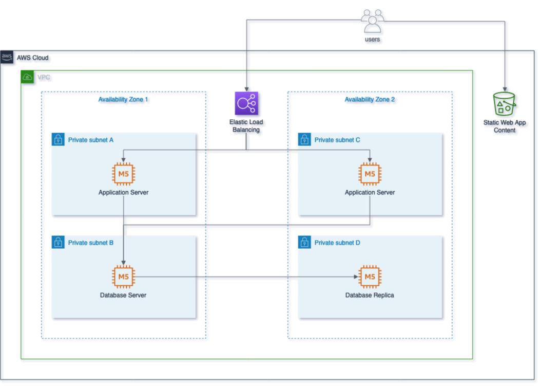 La carga de trabajo elegida fue una aplicación web de 3 capas. Para poder comparar precios a lo largo del tiempo, solo utilizamos los servicios que existían en 2008. Utilizamos instancias bajo demanda de Amazon Elastic Compute Cloud (Amazon EC2) para los servidores de aplicaciones y bases de datos, almacenamos contenido estático en un depósito en Amazon Simple Storage Service (Amazon S3) y Elastic Load Balancing (ELB) para distribuir automáticamente el tráfico entrante. Además, tenemos en cuenta un volumen de transferencia de datos a Internet (Transferencia de datos saliente o DTO).