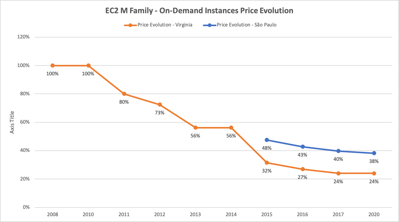 En el siguiente gráfico podemos ver que desde 2008 los precios de las instancias EC2 de propósito general han ido disminuyendo gradualmente, y en 2020, el cliente paga solo el 24% de lo que pagaria al inicio. Por ejemplo, en 2008, al usar una instancia Extra Large M1, el cliente pagaría 0,800 USD/hora. Hoy en día, utilizando la generación M5 Extra Large, el cliente paga solo 0,195 USD/hora.