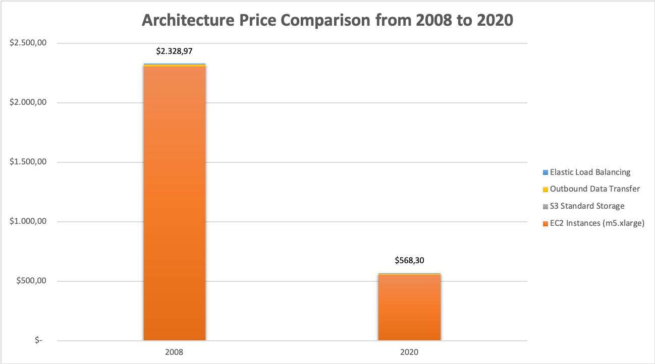 Después de este estudio y usando esa carga de trabajo de aplicaciones web de 3 capas para hacer una comparación, pudimos observar que esta misma arquitectura en 2008 costaba 2.328,97 USD/mes y actualmente cuesta 568,30 USD/mes, o sea 75% menos.