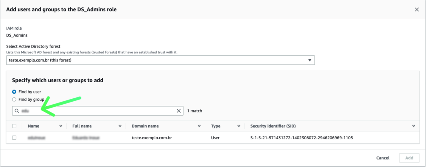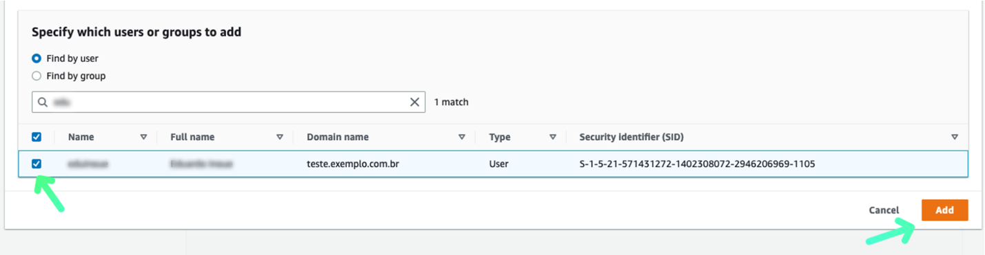 5. Seleccione el usuario o el grupo y haga clic en Add: