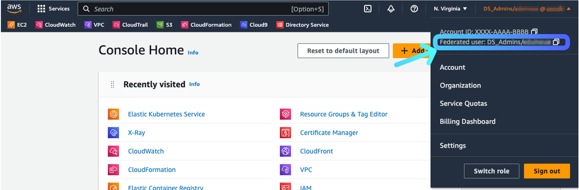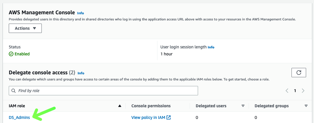 La próxima vez que el usuario inicie sesión en la consola de AWS desde la página de inicio de sesión personalizada, iniciará sesión con el rol de seguridad de DS_Admins.