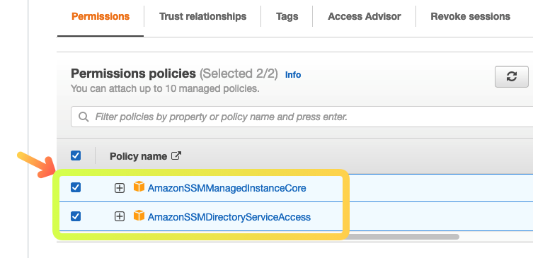 - En la página Add permissions, seleccione las políticas administradas AmazonSSMManagedInstanceCore y AmazonSSMDirectoryServiceAccess. (Para filtrar en la lista, escriba SSM en el campo de filtro)