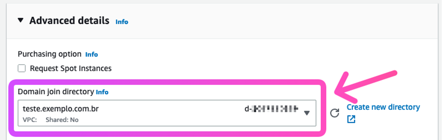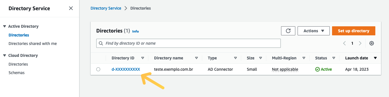 directoryIdes el ID del AD Connector que creó anteriormente.directoryNamees el nombre de dominio (por ejemplo, test.com.br).directoryOUes la OU del dominio.dnsIpAddressesson las direcciones IP de los servidores DNS que especificó al crear el AD Connector.