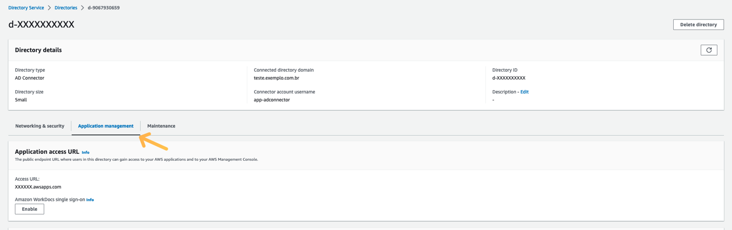 1. Abra la consola de AWS Directory Service y haga clic en la pestaña Application Management: