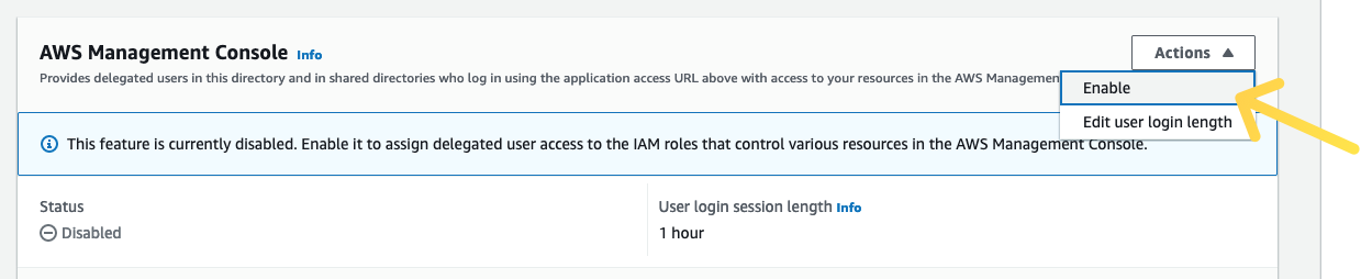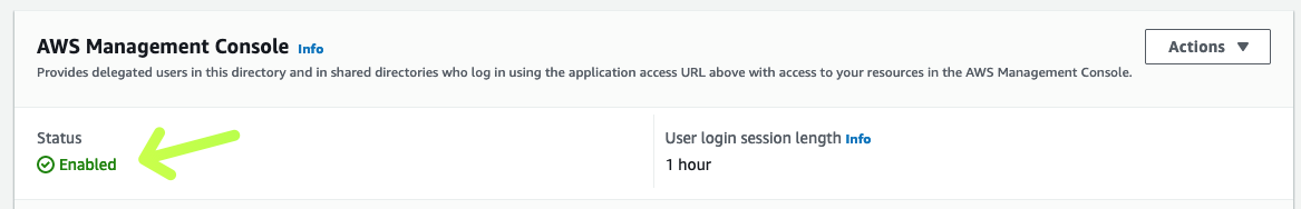 Para permitir que los usuarios inicien sesión con sus credenciales de Active Directory, se debe habilitar explícitamente el acceso a la consola. Para ello, abra la consola de AWS Directory Service y haga clic en el ID del directorio.