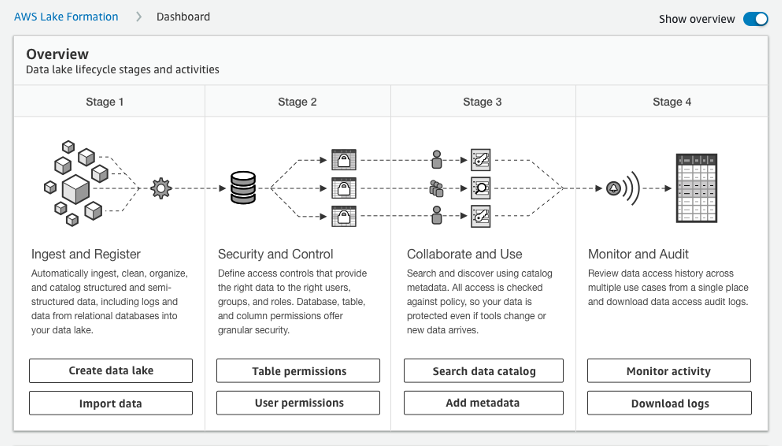 Además de la ingesta, preparación y uso de datos, Lake Formation añade controles de acceso granulares a nivel de columna, y monitoreo de operaciones para troubleshooting y auditoría.