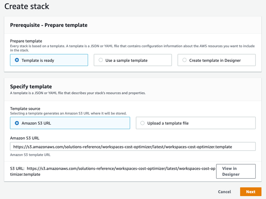 Esto lo llevará a la consola CloudFormation con el template del Optimizador de Costos ya seleccionado.