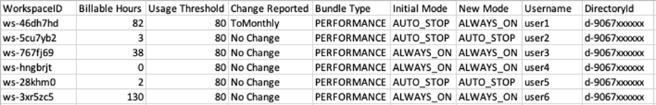 Otro uso de este reporte es revisar a fin de mes los usuarios con 0 horas de utilización en Amazon WorkSpaces; esta información puede ayudarle a decidir si es necesario mantener o terminar el WorkSpace para ahorrar aún más.