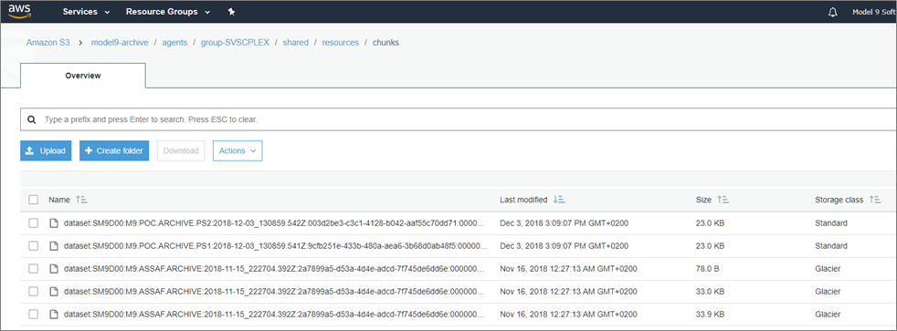 Figura 3 – Bucket de Amazon S3 que muestra conjuntos de datos archivados con Model9.