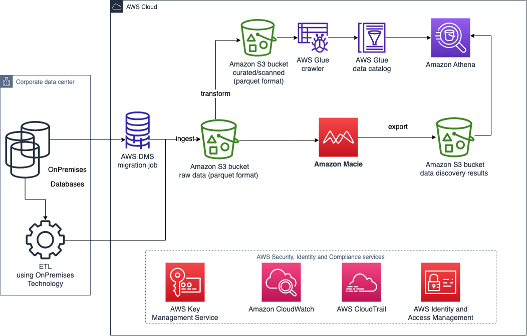 - Inicialmente, se realizó la primera ingesta de datos en estado puro (raw data) al Lago de Datos (Data Lake) de SMNYL, se habilitó el servicio de Amazon Macie para la organización, y se ejecutó un trabajo de descubrimiento (job discovery) preliminar con Amazon Macie con datos muy cercanos a los reales.