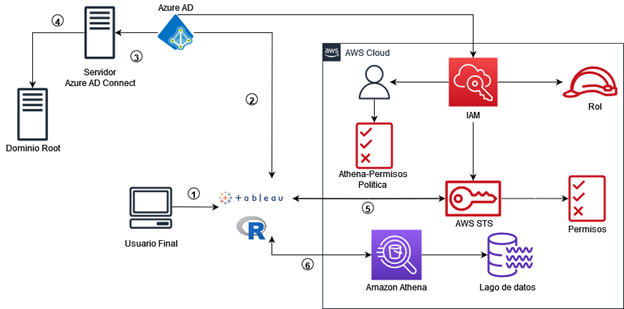 La arquitectura permite gobernabilidad y control de acceso por medio del directorio activo. Los servicios de AWS Identity and Access Management (IAM) y AWS Security Token Service (STS) generan las credenciales temporales para ser usadas por los usuarios de los equipos en Tableau y R para el análisis de datos con Amazon Athena.