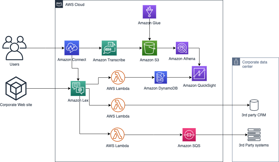 Esta arquitectura permite que las llamadas que llegan al Contact Center puedan ser enrutadas a Amazon Connect donde Amazon Lex identifica la necesidad del cliente y usando AWS Lambda puede interactuar con bases de datos de otras aplicaciones para obtener la información que el cliente requiere o bien generar la solicitud de ayuda para escalar la necesidad del usuario a los equipos apropiados de segundo nivel que pueden solucionar el caso.