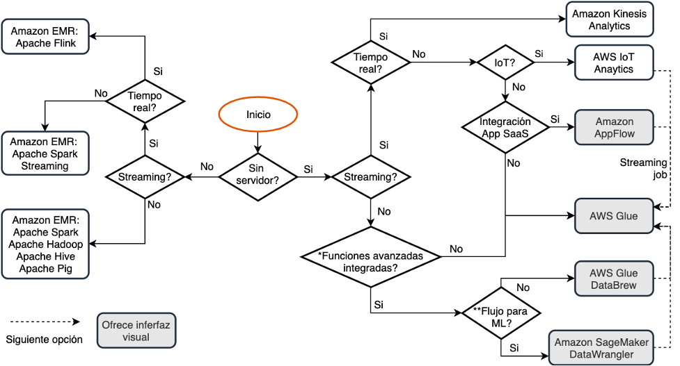 En este contexto, AWS ofrece un conjunto de servicios para implementar soluciones para realizar el procesamiento de los datos de acuerdo a las distintas necesidades y requerimientos: “una herramienta adecuada para el trabado adecuado”. Arquitectos, ingenieros y científicos de datos necesitan evaluar y decidir sobre los diferentes servicios y funcionalidades al momento de implementar un proyecto de ETL de tal manera que se seleccionen los servicios y capacidades que cumplan con una arquitectura de analítica bien diseñada. Los factores que pueden guiar estas decisiones van desde las características de las fuentes de datos (estructura, volumen, velocidad de generación), tareas de transformación (agregaciones, imputación, aprendizaje automático, etc.), integración con otros servicios, aprovisionamiento de infraestructura, lenguajes soportados, modelo de costos y cumplimiento de regulaciones entre otros. Esta evaluación multifactorial no es trivial, más aún cuando no se tienen claras las características para cada uno de los servicios, sus ventajas y desventajas frente al caso de uso a implementar.