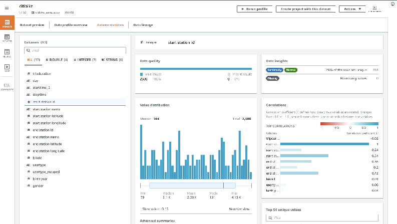 Figura 2: Ejemplo de visualización de un perfilamiento de datos en AWS Glue DataBrew.