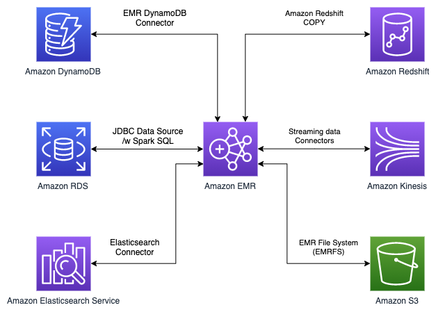 Amazon ElasticMapReduce (Amazon EMR) es la plataforma de big data destinada al procesamiento de grandes volúmenes de datos mediante el uso de herramientas de código abierto. Dentro de los frameworks orientados al desarrollo de ETL que incluye EMR se encuentran Apache Hadoop, Hive, Pig, Spark, y Flink. Amazon EMR facilita la instalación, el funcionamiento y el escalado de los entornos de big data al automatizar las tareas que toman mucho tiempo, como el aprovisionamiento de la capacidad y el ajuste de clústeres. Amazon EMR se puede utilizar para realizar de forma rápida y rentable cargas de trabajo de transformación de datos (ETL), como ordenar, agregar y unir conjuntos de datos de gran tamaño. Amazon EMR proporciona acceso directo a su entorno de Hadoop, lo que le brinda acceso de nivel inferior y mayor flexibilidad en el uso de herramientas del ecosistema Hadoop, a diferencia de AWS Glue que provee un entorno Apache Spark sin servidor. Amazon EMR proporciona varias formas de obtener datos en un clúster. La forma más común es cargar los datos a Amazon S3 y utilizar las funciones integradas de Amazon EMRFS para leer y procesar los datos en su clúster. También es posible utilizar frameworks para interactuar con datos almacenados en Amazon S3, Hadoop HDFS, y RDBMS.