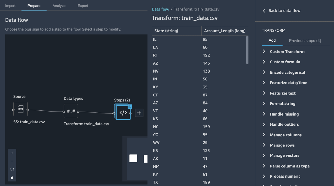 Figura 5: Ejemplo de visualización de un flujo de datos en Amazon SageMaker Data Wrangler.