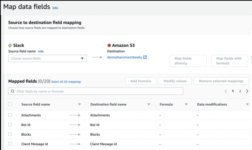 Figura 6: Ejemplo de un mapeo de datos desde Slack a S3 en Amazon AppFlow.