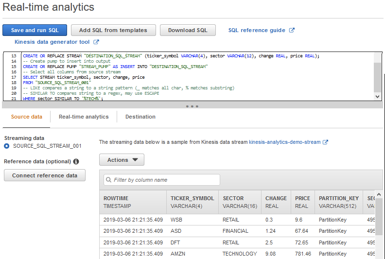 Figura 7: Ejemplo de definición de un stream de datos usando SQL en Amazon Kinesis Analytics.