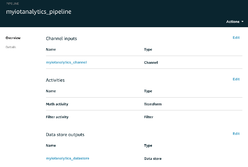 Figura 8: Ejemplo de definición de actividades de transformación en un pipeline de AWS IoT Analytics.