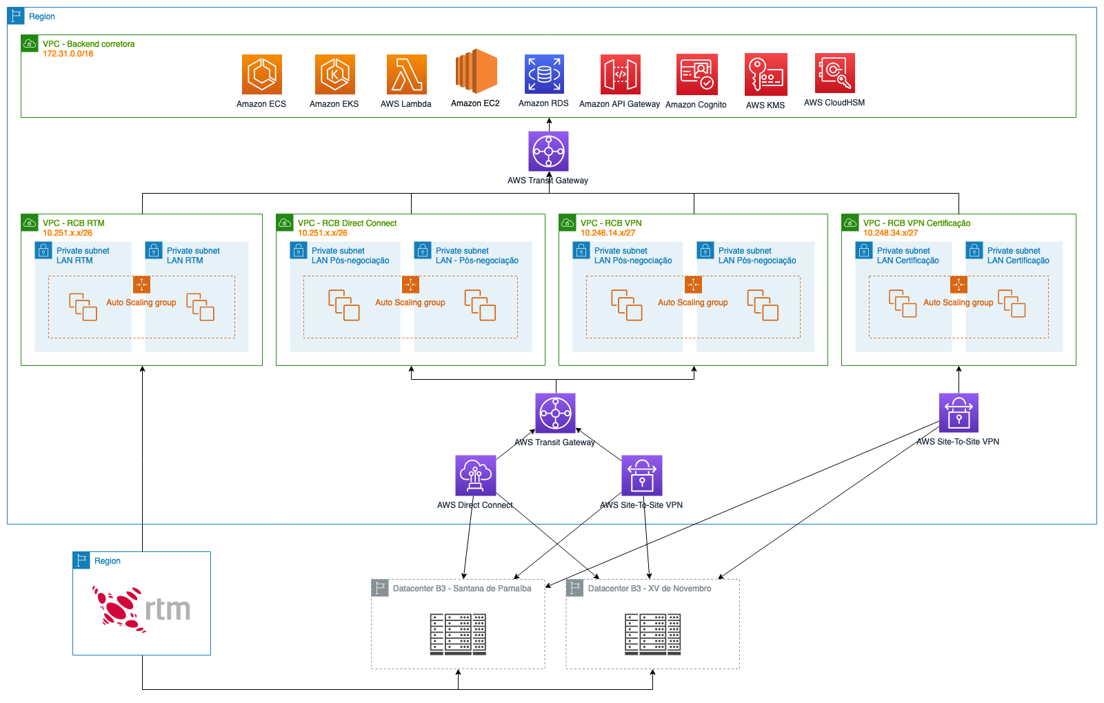 En el diagrama podemos ver que los sistemas de post-trading se encuentran en los datacenters de B3. Para una conexión segura entre ellos y la nube de AWS, las empresas pueden utilizar servicios como AWS Direct Connect o AWS Site-to-Site VPN. Para administrar las rutas, la escalabilidad y la seguridad de su entorno, también pueden utilizar AWS Transit Gateway. La ventaja de usarlo es que los clientes pueden contratar varios AWS Direct Connect y configurar balanceo de carga entre ellos, o establecer múltiples conexiones VPN y beneficiarse de Equal Cost Multipath (ECMP) , implementado de forma nativa por AWS Transit Gateway.