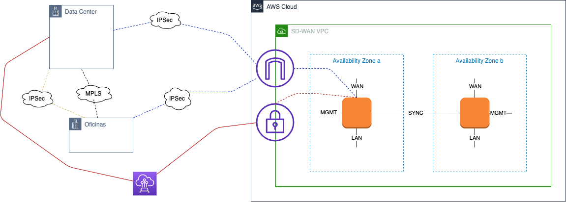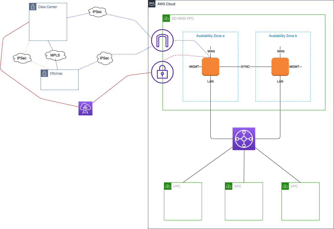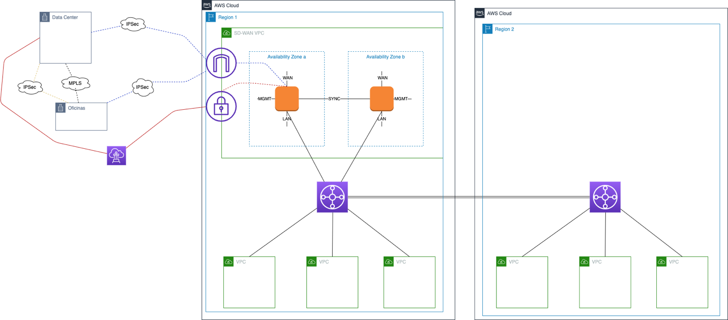 En una Virtual Private Cloud (VPC) de entrada a la nube veremos como el tráfico ira siempre al salir y al entrar a la VPC por las máquinas virtuales que alojen a la SD-WAN y serán estas las que definan que camino tomar a través de las redes, ya sea por una regla explicita, por latencia o simplemente por distribución del tráfico.