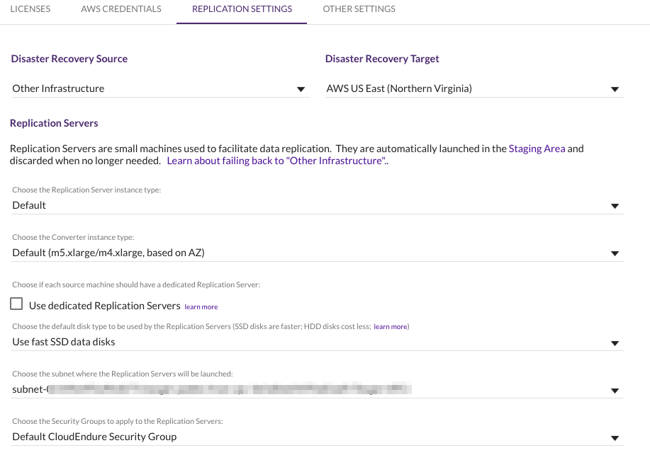 Para Azure, elija Other Infrastructure. También debe proporcionar la subred en la que se lanzará el servidor de replicación de AWS en el área de ensayo y el grupo de seguridad que utilizará. Mantenga el tipo de instancia para el servidor de replicación como predeterminado.