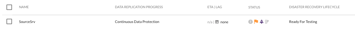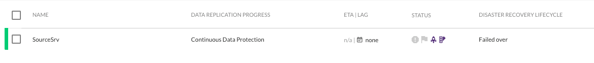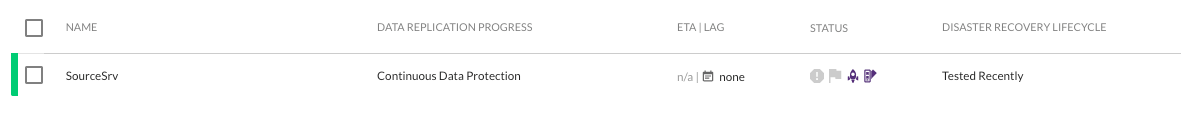 Una vez que la máquina de prueba se haya creado correctamente, la columna Disaster Recovery Lifecycle mostrará «Tested Recently» con una barra verde a la izquierda del nombre de la máquina. Esto significa que la máquina ya está lista para el failover.