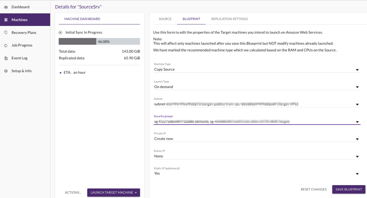 Mientras espera a que se complete la sincronización de datos inicial y cambie al estado Continuous Data Protection, elija Machines en el panel de CloudEndure para ir a la página Blueprint.