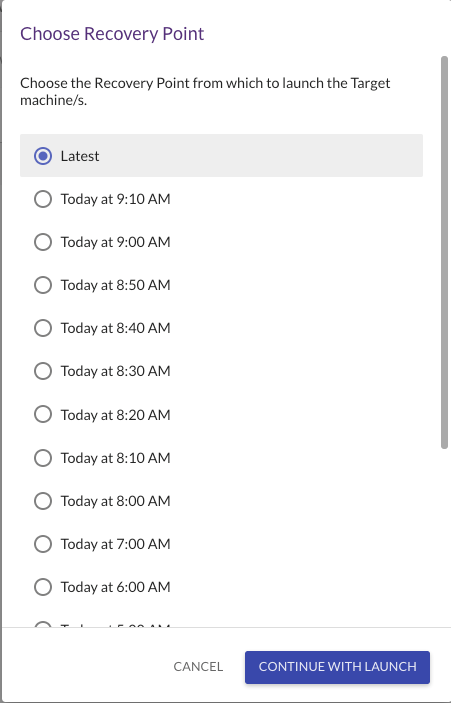 Para ello, seleccione la máquina y a continuación, seleccione Launch Target Machine> Test Mode. A continuación, debe seleccionar el snapshot de la maquina que desea recuperar. CloudEndure DR le permite seleccionar de forma predeterminada entre 60 snapshots por disco por mes. Seleccione Latest y luego Recover.