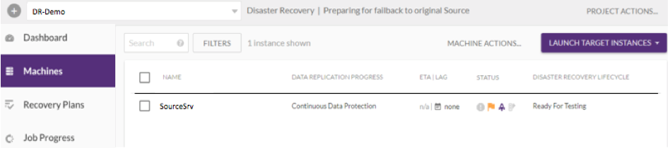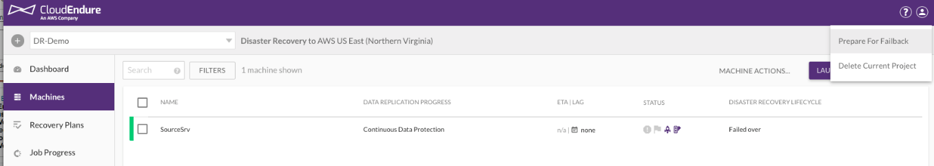 - Prepare el proyecto el failback seleccionando la opción Prepare for Failback en el menú Project Actions de la consola de usuario.